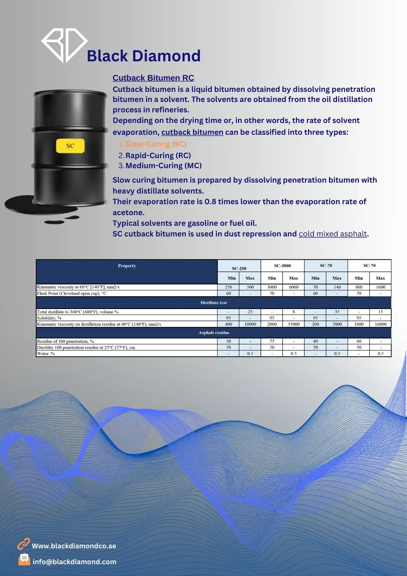 Cutback bitumen SC-70 is a slow curing bitumen that contains 50% bitumen. This bitumen is black in color and is produced under the ASTM D 2026M-15 standard.